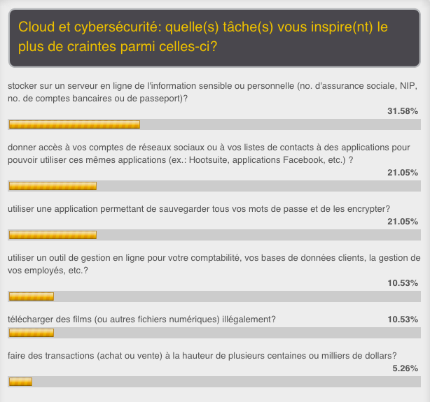 Je suis un peu surpris du pourcentage de gens craintifs d’utiliser le cloud pour y stocker des données sensibles. J’aurais même tendance à croire que ce pourcentage serait beaucoup plus faible si ce sondage avait été mené à grande échelle, et non restreint au lectorat du blogue Le feu sacré. La tendance ne va que s’accroître au fil du temps. De plus en plus de gens vont graduellement stocker leurs données sensibles en ligne, de la même manière que de plus en plus de gens procèdent désormais à leurs transactions bancaires en ligne. La confiance, ça se gagne doucement, et les résultats de ce sondage en font foi!